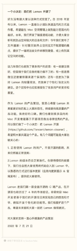 腾讯将其为 macOS 开发的「腾讯柠檬清理」(原腾讯电脑管家 Mac 版产品线)以 GPLv2 和 GPLv3 协议在 GitHub 上开源。