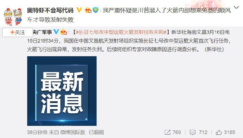 今天abc看了啥🤔 16日21时34分,我国在中国文昌航天发射场组织实施长征七号改中型运载火箭首次飞行任务,火箭飞行出现异常,发射任务失利。后续将组织专家对故障原因进行调查分析。 https://mp.weixin.qq.com/s/zVRMgMSgb_PxUk4HR4KHqg